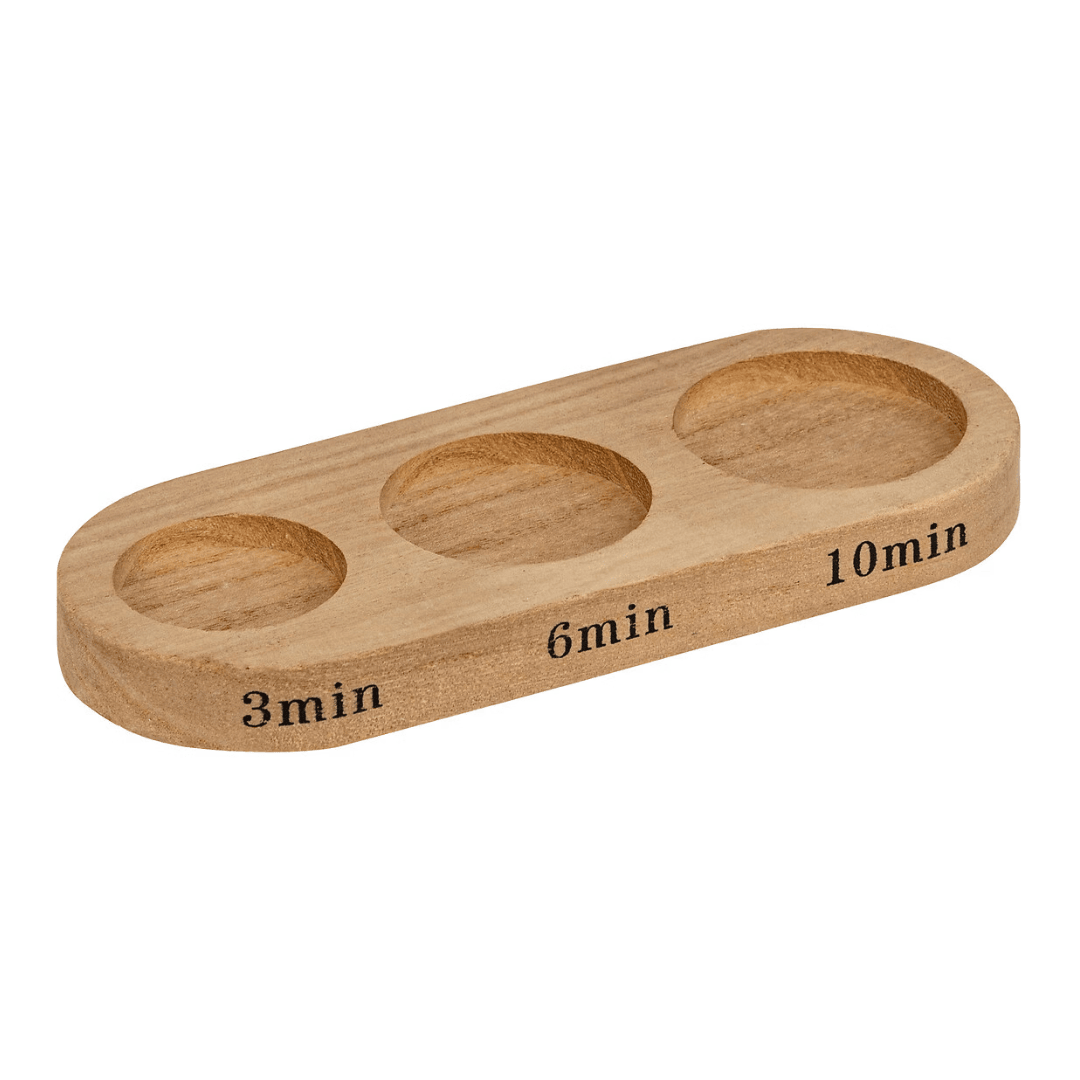 - The Wooden Base: The set is united by a sleek, curved wooden base with clearly engraved labels for 3 min, 6 min, and 10 min, ensuring each timer is securely and stylishly held.